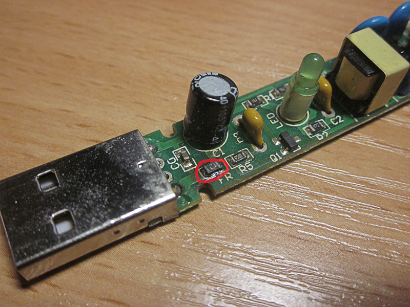 Здравствуйте. Достался в пользование USB ионизатор. Данный аппарат оказался не рабочим. Когда разобрал корпус увидел, что сгорела одна деталь. Я не силен в радиотехнике, но судя по обозначению на плате и поиска инфы в гуле, выяснил, что это может быть предохранитель. Но не смог по маркировке детали найти нужную. Помогите, пожалуйста, с опознанием детали. Заранее спасибо. PS На самой детали была маркировка 401 или L01, что-то похожее. Я пытался удалить налет сажи и стел надпись:(