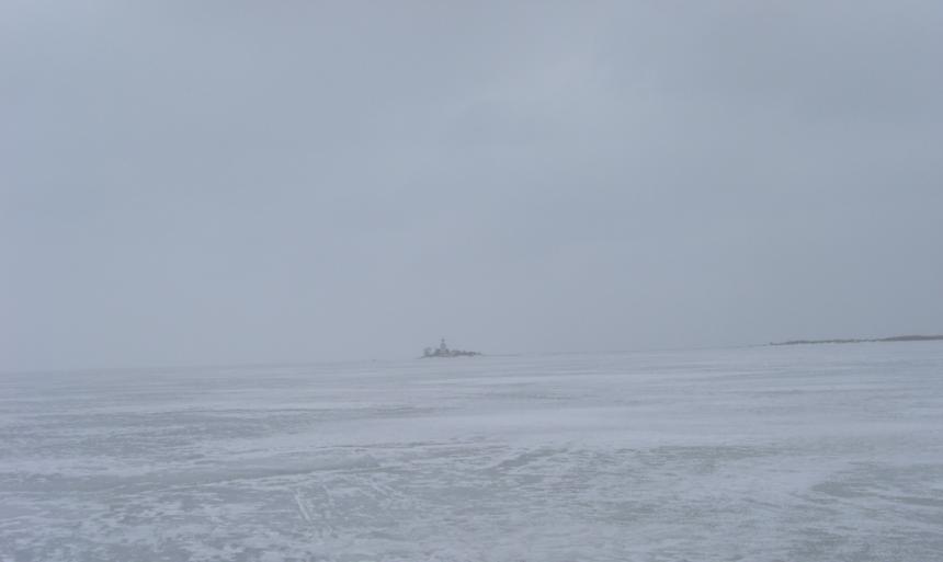 На остров пришлось идти по льду 8 километров от того места , куда ещё можно подъехать на машине.Лёд довольно толстый- заглянул в лунку у рыбаков ( в субботу довольно много сидело на льду озера) - не меньше 30-40 см..... В монастырь на остров два года назад провели подводный кабель, так что теперь у них постоянное электропитание. Вот немного фото - как сейчас выглядит монастырь . На глянцевой открытке- конечно красивее.............. Только появился на горизонте Вложение: