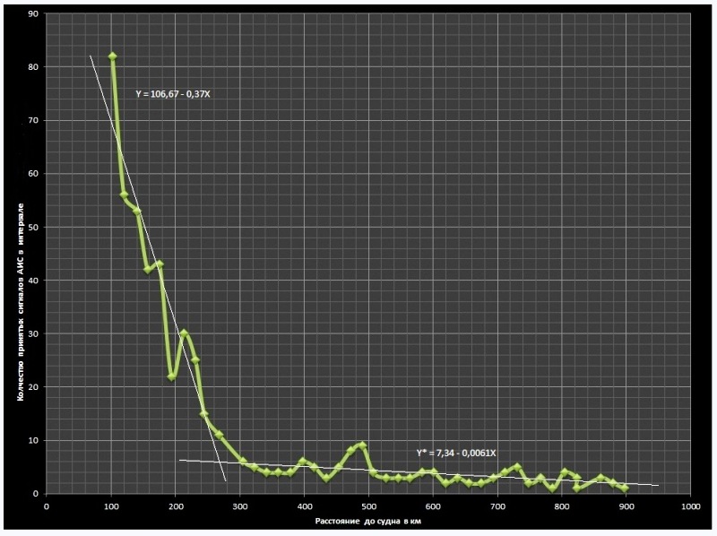 Можно предположить, что подобный ход графика ( два совершенно разных линейных этапа) отражает и два принципиально разных механизма распространения сигналов от отдалённых передатчиков АИС .Первый на дистанциях от 100 до 250 км и второй - свыше 300 км.