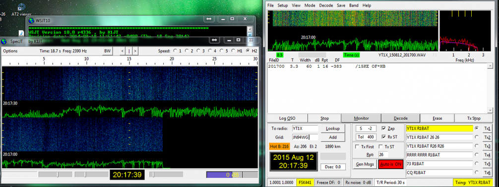MS Связи, или как это было у меня ) Я не когда не работал через отражение от луны, спутников и другой летающей нечисти. За один день я начал изучать в просторах интернета информацию про работу через метеорные потоки. WSJT у меня уже было установлено, антенны крутились, и запал был на всё ночь. В чате on4kst очень много желающих провести QSO. В общем за 5 часов работы в MS я удалил и установил три разных версии WSJT, И вот на конец то появились бусты ! С горем пополам я смог провести всего 4 связи. Самая дальняя 2200 км. Не смотря на мощность в 50 ватт и стек 2х9 элементов установленный очень низко. MS связи действительно очень увлекательные. Продолжаем изучать дальше )) Вот как то так. R1BAT OK2ZW 2014-08-12 20:53 2M FSK441 R1BAT OK2PMS 2014-08-12 18:59 2M FSK441 R1BAT PA0JMV 2014-08-12 15:31 2M FSK441 R1BAT RC4HAA 2014-08-12 13:54 2M FSK441    Строго не судите...