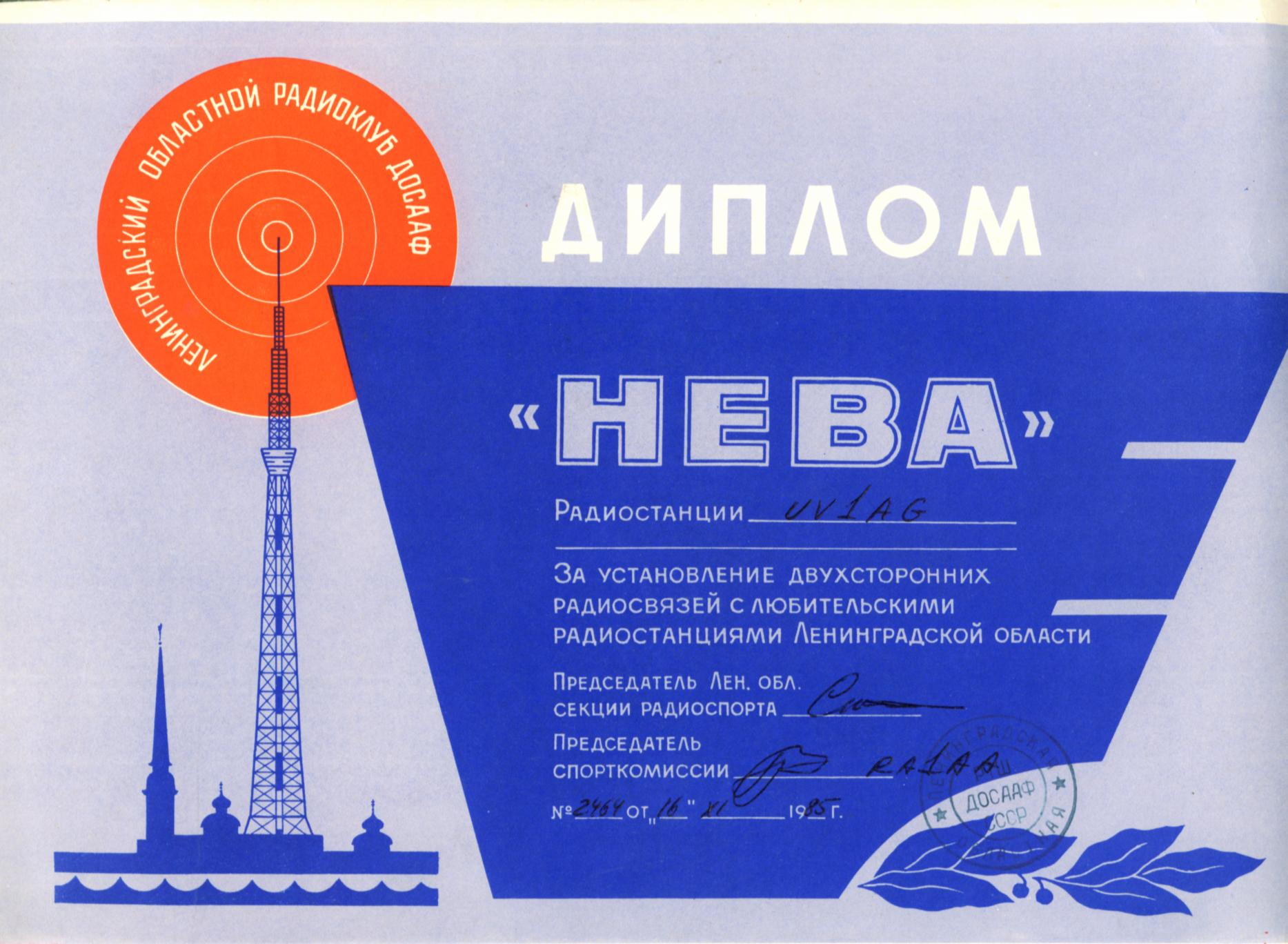 У меня вопрос к тем, кто занимается радио ещё с советских времён. Помните ли вы такой диплом "НЕВА"? Вопрос не праздный, а связан напрямую с возрождением этого диплома. Как известно, по сообщению в соседнем разделе, собрание членов РО СРР по ЛО единогласно утвердило решение возродить этот диплом. Суть его проста: надо было провести связи с 25-ю радиолюбителями области. Пока предварительно решено оставить прежнее положение, адаптировав его к современным реалиям. Ну и вопрос встаёт о дизайне. Здесь бы я хотел объявить конкурс на дизайн данного диплома. У кого есть какие предложения, пишите. К старой школе обращаюсь, что бы было остальным понятно, прошу выложить скан старого диплома "НЕВА", если у кого есть.