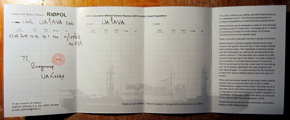 Оригинально оформленную QSL получил на днях по почте за наблюдение RI0POL, о этой станции я писал в этой ветке ранее, НЭС Ледокол Михаил Сомов, с экспедицией по побережьям северных морей и океана.
