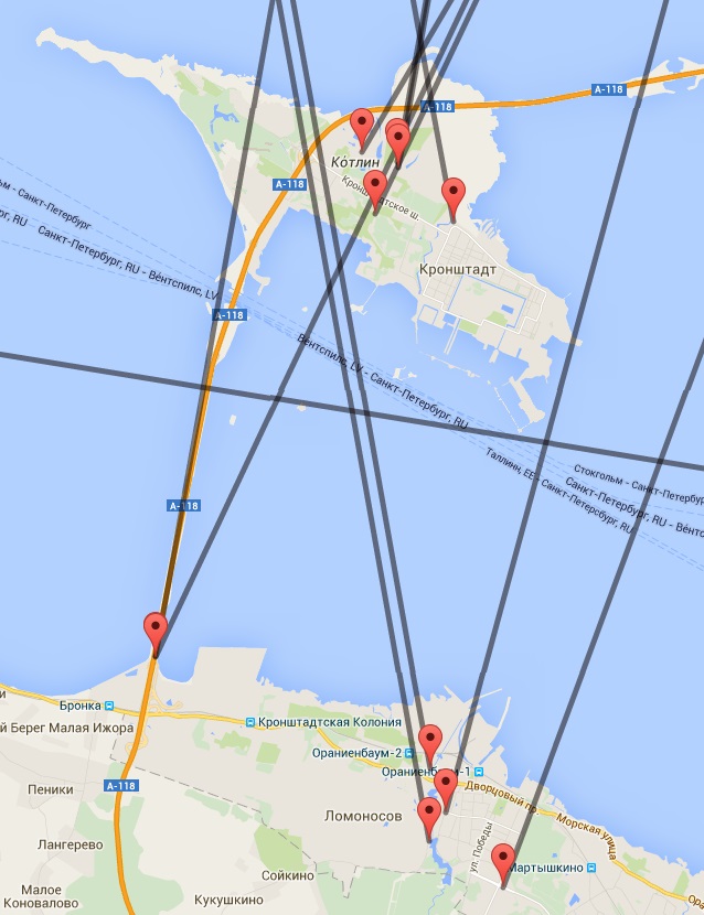 Пеленги брали с Энколово. Первый на 240. ЮБФЗ, Ломоносов и те края. Решили рвануть и смотреть по ходу и уровню сигнала. В пути уровень увеличивался.