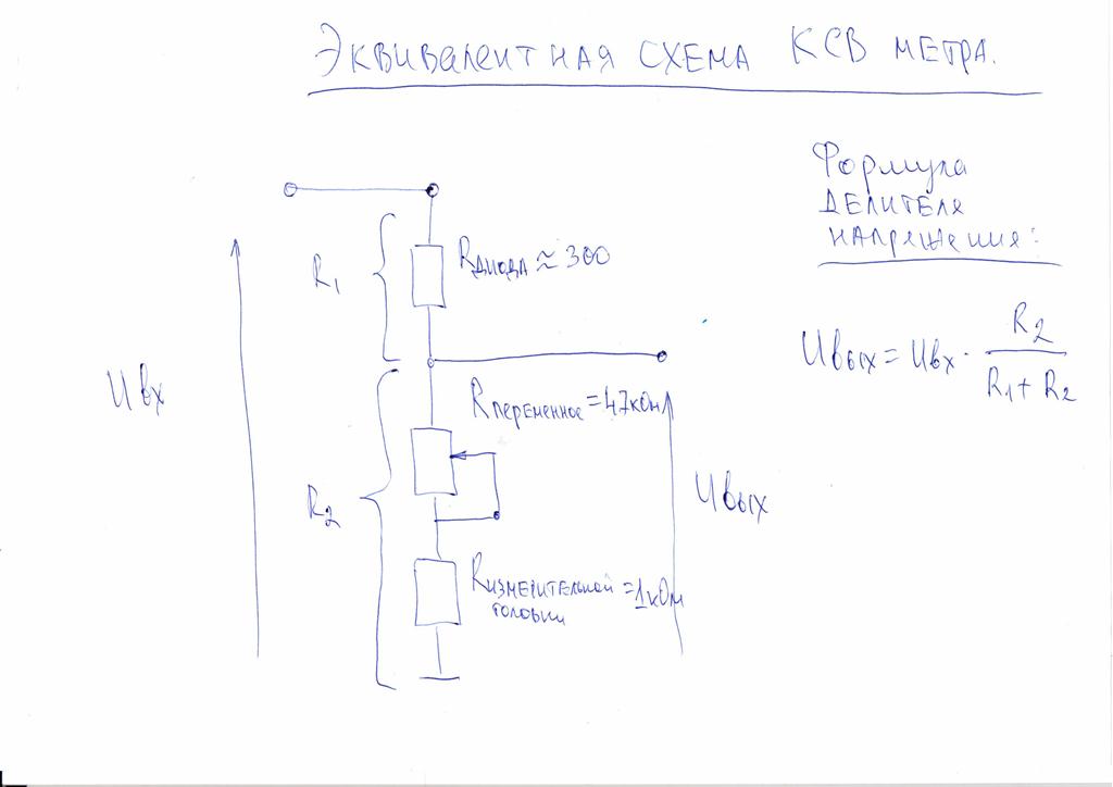UB1AJU писал(а): RL1L писал(а): Не 3к, а 7.1к. На 5вт сопротивление должно быть 12.4к. При 5 Вт на холостом ходу по прямой волне 1,8 В, на подгруженном 47 кОм - эти самые 1,32 В. При нагрузке 3,3 кОм - 0,9 В. Очень похоже на эффект однополупериодного выпрямления - без нагрузки "тянет" до амплитуды, а с нагрузкой "устаканивается" на среднем? Вот эквивалентная схема КСВ метра. Ее надо рассматривать как делитель напряжения. Если на входе 1.8в, то при подключении сопротивления 47к напряжение упадет на 0.02 вольта, а вот при подключении 1к как раз и будет 1.32в, следовательно или переменное сопротивление закорочено или сопротивление подключается параллельно измерительной головке, а так как сопротивление измерительной головки 1к, а переменного 47к суммарное сопротивлениеи около 1к и будет. Переменное сопротивление подключается последовательно с измерительной головкой и не как иначе, тогда шунтирование выходного сигнала будем минимальнвм. Поэтому при поключении сопротивления 12.4к(последовательно с прибором), которое необходимо для полного отклонения стрелки прибора на 100 делений, напряжение упадет всего на 0.5в и будеи составлять 1.75в.