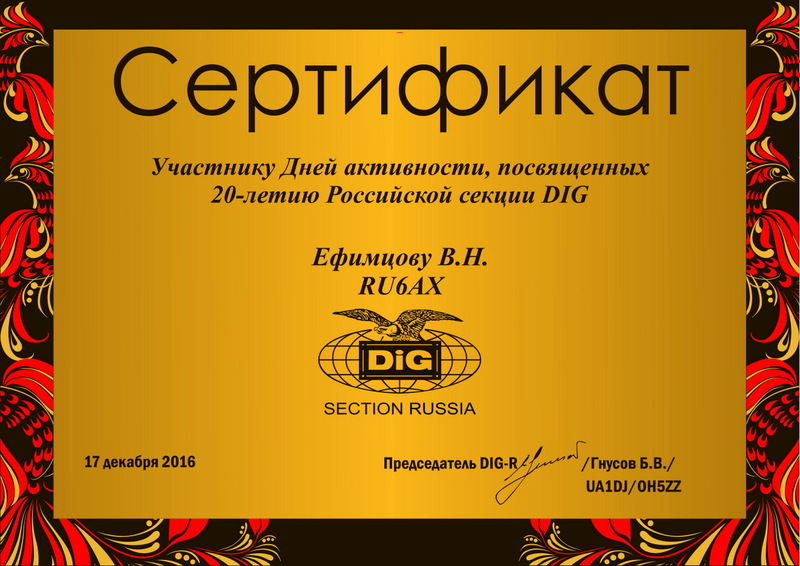 ua1ana писал(а): Еду на дачу, оттуда буду работать. А где дача? Было бы интересно встретиться. На 3,5 MHz в дневное время активность будет, видимо, не очень высокой, но буду иногда включаться для связей с земляками. Значительно больше времени проведу на 7 MHz, где, кстати, SPb и ЛО часто проходят днём. Сергей, учреждена и подготовлена к рассылке новая именная плакетка "W-DIG-R". Главная ценность в ней - сложность выполнения условий для её получения. Это - трофей, который не станет массовым, для его получения нужно направленно заниматься охотой в эфире за членами российской секции DIG. Сложность ещё и в том, что связи, включённые в заявку, должны быть подтверждены QSL. Для тебя и других ветеранов DIG-R задача упрощается тем, что засчитываются связи, начиная с 1996 года (года образования DIG-секции России). Связи, проведённые с нашими коллегами, которых уже нет в живых, не только засчитываются, но дают удвоенное количество очков. Если ты проверишь полученные от членов DIG-R карточки, то вполне возможно наберёшь необходимое количество очков. Если очков будет меньше, то три дня активности позволят добрать необходимое количество. Тем более, что за связи, проведённые 10-12 декабря с.г. подтверждения карточками не требуется, они будут подтверждены отчётами. У меня эта задача уже решена: заявка отправлена, жду плакетку, которая будет напоминать о наших с тобой стараниях по организации секции, круглых столов и Международной DIG-встречи в гостинице "Москва".