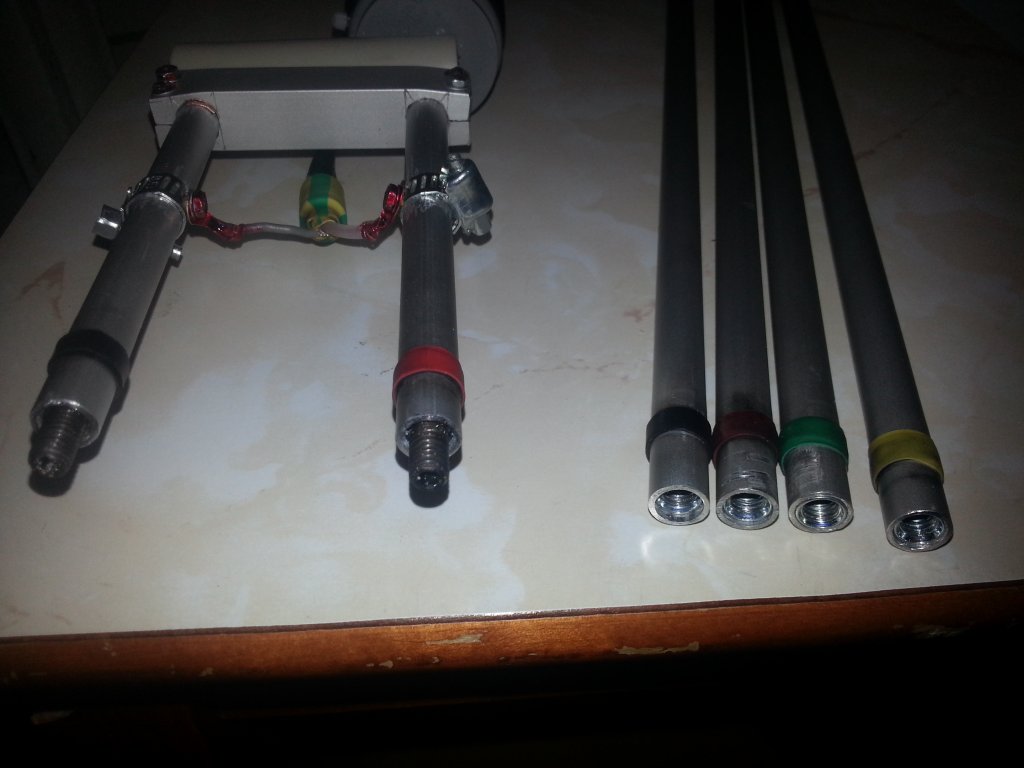 Собственно, ничего особенного. Обычная J-антенна, беспроигрышный вариант для начинающего. Но этот вариант - второй, мобильный, для прогулок, выездов, командировок, путешествий, отпусков. Длина в разобранном виде - не более 0,5 метра (бросить на дно вещевой сумки). Конструкция. Трубка D10 из Максидома, дюралька. Разжимные цилиндрические анкеры М6 и центровочные винты (с острием с одного торца) - из магазина Метизы. Кусок пластиковой водопроводной трубы для балуна - тоже из Максидома. Оттуда же хомутики для подключения фидера. Трубка нарезана на отрезки длиной не более 500 мм, с торцов забиты анкеры и закручены центровочные винты. Чтобы не перепутать колена при сборке, нанесены метки из термоусадки. КСВ получился 1,07. Частота - 145 МГц.