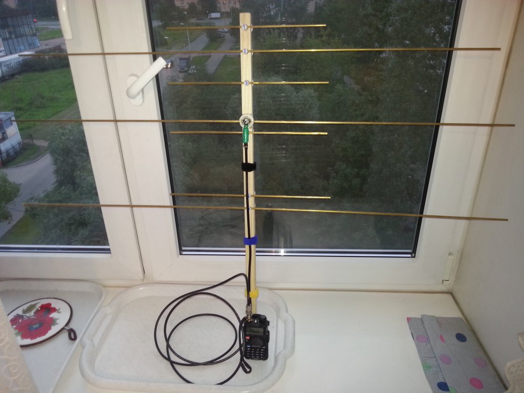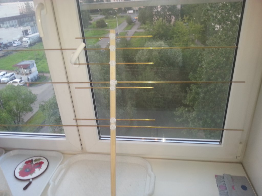 feding писал(а): UB1AJU, значит в конструкцию крепления директоров будет внесено изменение? Каждый из директоров будет крепиться с помощью такого кольца (куска трубы забитой в пробку)? Практически готовая антенна. Подключить кабель, закрепить его на кругляшке с вибратором - чтобы не оторвался (два миллиметровых отверстия, два витка капроновой нитки и пропитка лаком ХВС) - и все. Ну еще липучки для съема кабеля. Антенна получилась практически невесомая.