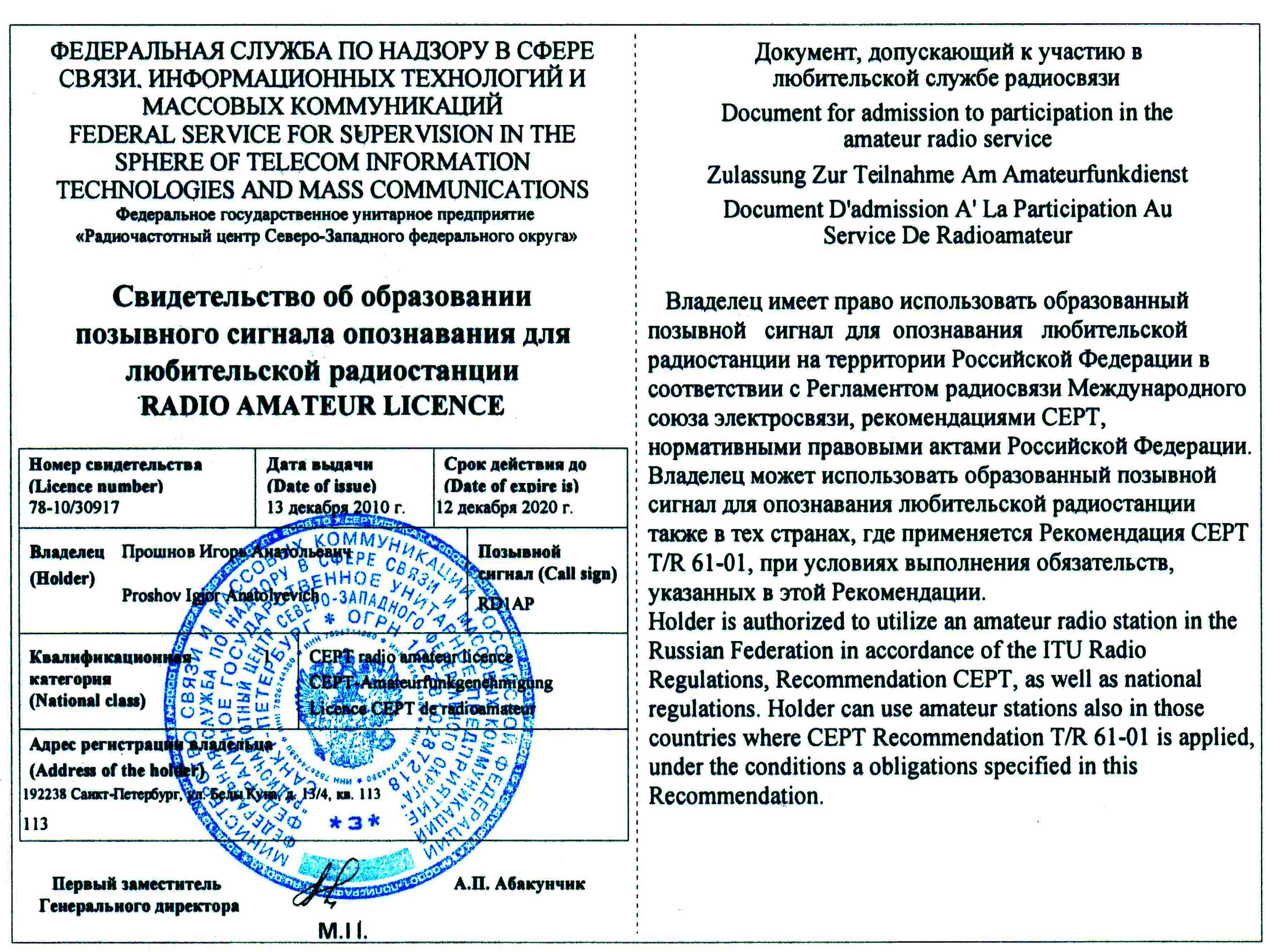 Я, кстати, специально получал новую лицензию (читай, свидетельство об образовании позывного сигнала опознания), дабы в ней было написано про все эти CEPT и HAREC. Стоило это бесплатно, ездить никуда не надо было и на все про все вместе с пересылкой Почтой России ушло полторы недели. Хотя финская бумажка, фото которой тут выложил RD1AP, у меня тоже есть.
