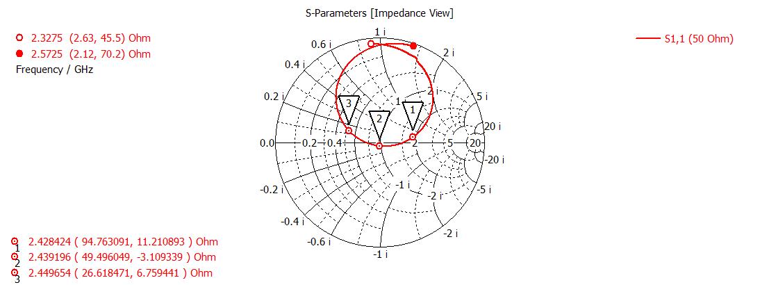 Судя по диаграммам Сммита патч немного короткий, потому что, есть реактивность на 2.44 ГГц. Надо смотреть входное сопротивление на горизонтальной прямой, тогда там будет чисто активное сопротивление, ну а частота какая получится и тогда уже смотреть, что нужно сделать с патчем, но скорее всего надо увеличить размер, а сопротивление какое получится, потом трансформаторами с трансформировать.