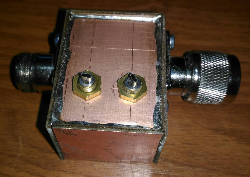 Вот макет согласующего устройства на 145 мгц. На анализаторе можно увидеть характеристики СУ при разных нагрузках. Пока нагрузил на 50 ом, КЗ и обрыв нагрузки, потом подберу несколько сопротивлений разного номинала и проверим диапазон согласования. Ну уже и сейчас видно, что при уменьшении нагрузки СУ хорошо держит КСВ, вплоть до КЗ. При обрыве КСВ=3, здесь скорее всего диапазон будет по меньше. Пока КСВ=1.3 потом более тщательно подберу отводы. Пришлось не много усовеншенствовать и сделать автотрансформаторную связь между резонатором и разъемами. При индуктивной связи коэффициент передачи получался -8дб, видно с растоянием и длиной катушек связи не много ошибся. Какие будут поправки пока еще макет и можно опробовать все варианты.