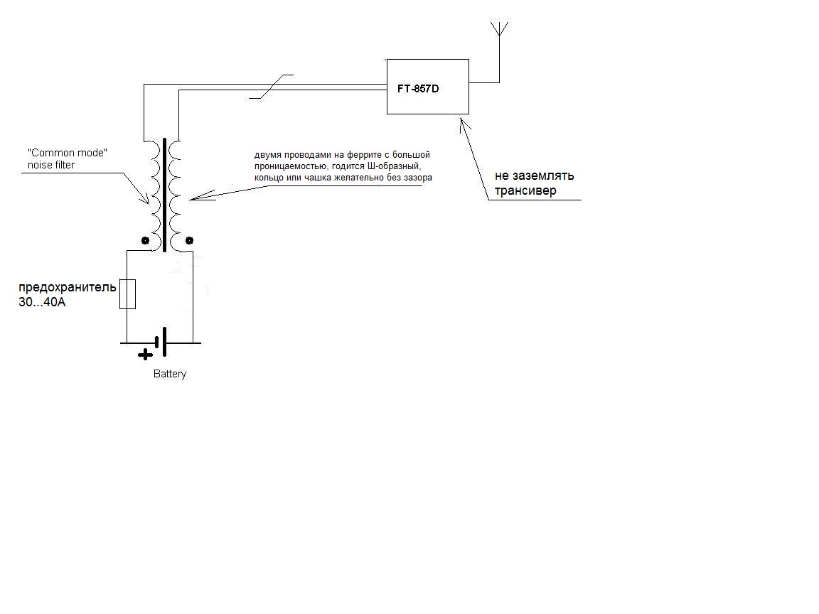 На не первой своей машине и на машинах друзей трансивер подключаю следующим образом: -от трансивера тяну пару проводов нужного сечения(желательно не разрезая пару или свить пару необходимого сечения) прямо к клеммам аккумулятора; -не заземляю трансивер и антенну; -у клемм АБ в плюсовом проводе ставлю предохранитель на 30...40А и рядом делаю фильтр на любом замкнутом феррите, можно Ш-образный, можно чашку, можно кольцо, проницаемость желательно больше 2000, Ш и чашки желательно без зазора; -фильтр представляет собой намотку этой же парой проводов до заполнения окна феррита, но желательно в один слой; -фильтровые конденсаторы между проводами можно ставить по желанию, а на корпус авто нельзя; -у самого трансивера фильтр не делаю, так как в большинстве трансиверов он уже есть, и в FT-857D имеется. Питание беру с АБ, так как эта точка самая чистая в плане пульсаций в авто, АБ представляет собой очень хороший конденсатор и его "-" это главная точка заземления и самая чиста в плане помех. В результате работаю из машины с включенным двигателем и без и не имею проблем с помехами в SSB и CW, а в FM тем более.