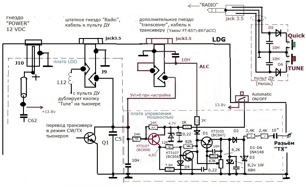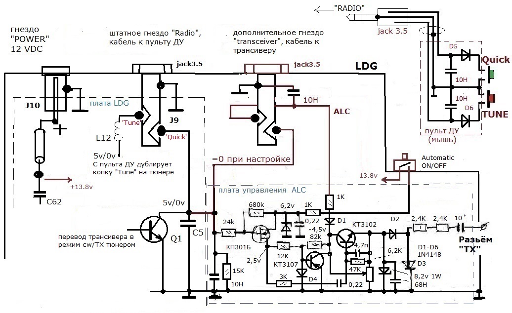 Предлагаю доработанную схему и добавку к тюнеру LDG AT-200ProII Autotuner - пульт ДУ, который хорошо вписался в гнездо "Radio". Работать стало интереснее и проще. Пульт ДУ облегчил настройку - клавиша "Quick", при нажатии мощность будет снижена автоматически до безопасного уровня и произойдёт настройка КСВ (тюнер в автоматическом режиме). Функции гнезда "Radio" ни как не менялись, просто использую его возможности. Кстати используя эту клавишу удобно подстраивать КСВ кнопками тьюнера: C up, C Dn, L up, L Dn. Можно работать и без пульта ДУ, в этом случае запуск настройки КСВ кнопкой "Tune" на тюнере (мощность будет автоматически снижена до безопасной). Общий принцип построения тот же, но найдены лучшие решения как для стабильности работы так и удобства, и надо рассказать о них. Транзистор КТ3102 сокращает время начала срабатывания ALC. Диод D1 не позволяет влиять на ALC трансивера после настройки. Диод D4 стабилизирует режим работы КТ3107. Проведено более 5000 настроек. Ни одного отказа или каких-то неожиданностей. Внутри тюнера ничего не крутилось, фольга нигде не резалась, штатно установленные детали не удалялись и не менялись. Считаю, что получилась простая, надежная и удобная приставка-плата к тюнеру LDG AT-ProII Autotuner.
