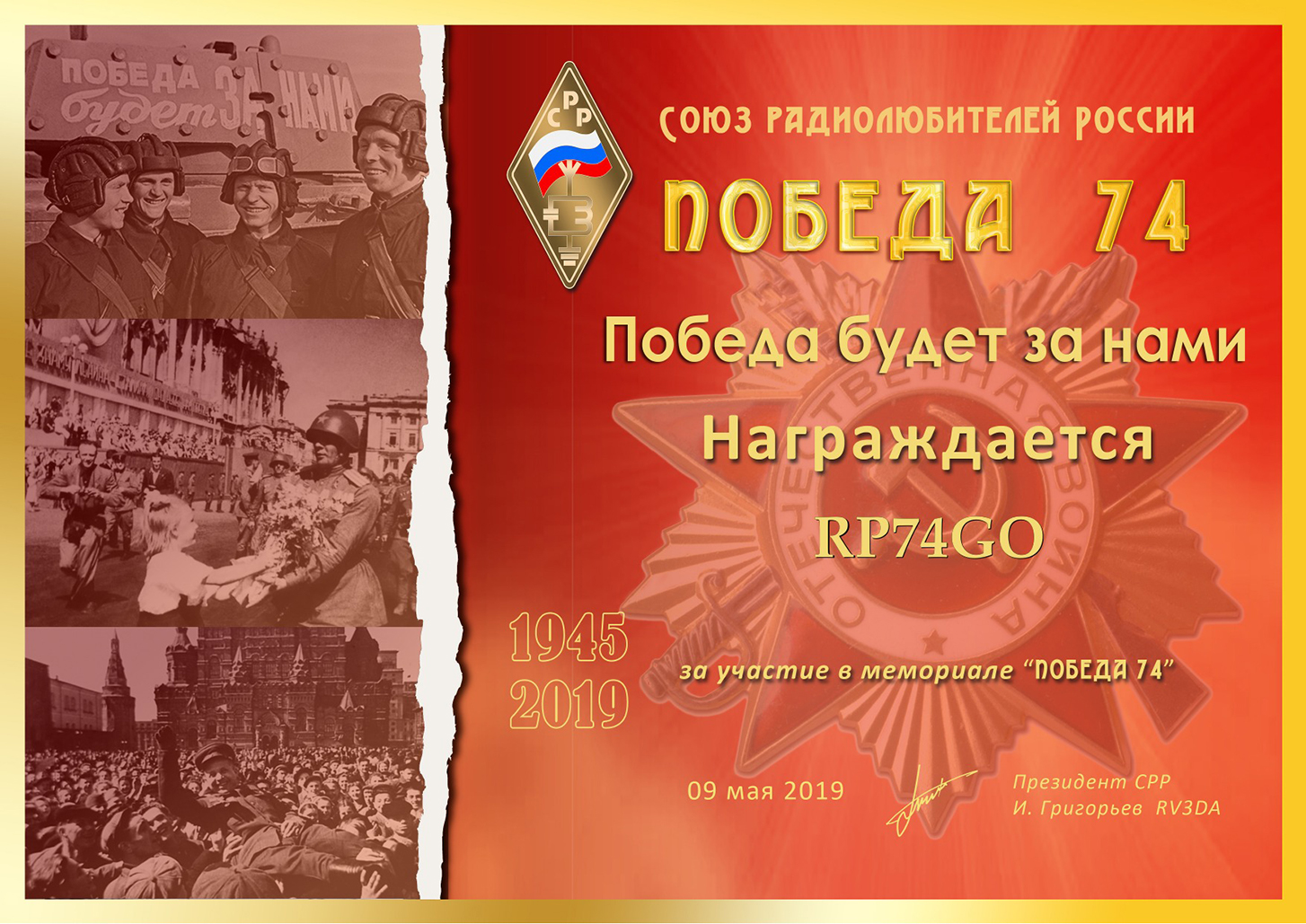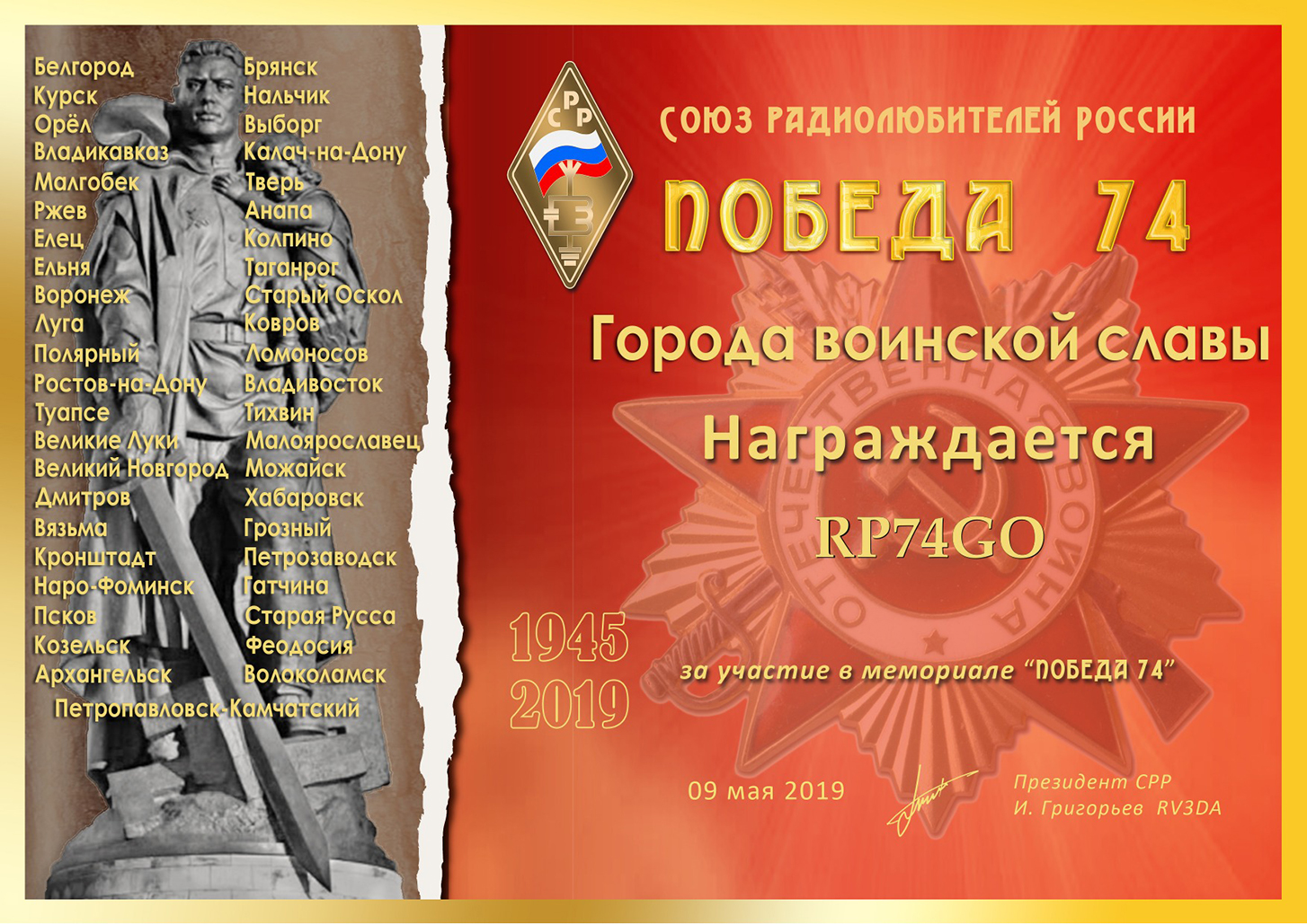 Спасибо всем, кто принимал участие в работе мемориальной станции RP74GO. Особая благодарность Никите RA1AO, Александру RD1AS, Андрею UA1ASC, Сергею R1BAH, Александру RA1AJA! Вложение: