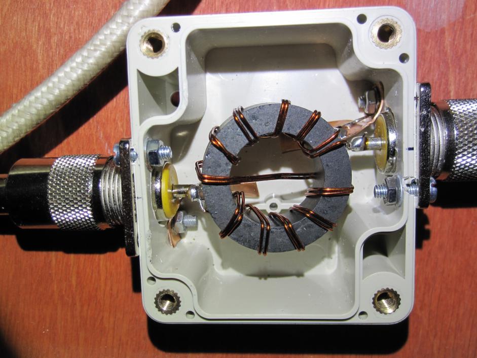 Немного покритикую. Первым делам нужно развальцевать коаксиальный разъем, на фото слева видно, что желтый изолятор немного вылез. У меня тоже есть такие разъемы и намучился пока случайно не обнаружил, что при вставлении штекера в гнездо разъема, последнее выдавливается и ухудшается контакт. Устраняется просто, тупой отверткой или зубилом с обратной стороны крест на крест сделать фаски, получаться вмятины, которые и будут держать изолятор. Следующее: линия имеет перехлест, конечно это мелочи, но все же, лишние неравномерности. Если провод имеет диаметр менее 1 мм, то лучше его легонько скрутить. Но лучше всего сделать просто коаксиальным кабелем, у него нормированное сопротивление и не меняется при намотке на кольцо, а двухпроводную 50 Омную линию нужно еще сделать. На 50 МГц можно для симметрирования, просто коаксиальный кабель катушкой намотать.