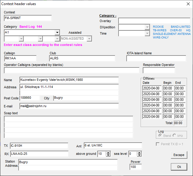 Поделитесь, кто в каком логгере работал. Мне лень было ковыряться с AATest, в котором я работал в чемпионатах осенью, стал работать в UCXLog. Он повторы по турам не отслеживает, но я предполагал, что число связей у меня будет так себе, так что заранее решил следить за повторами вручную. Не понял, зачем он мне периодически подставлял трехзначное RST в FM - замучился удалять по одной девятке из принятого и переданного. Где там настройки RS/RSM для FM - никто не знает? И, кто не знает, при формировании edi из UCXLog можно писать свои ФИО и разряды латиницей, мой робот переведет в кириллицу (хотя и коряво - потому я в таблице ЕвгенЫй). Но зато ругаться не будет. Вложение: