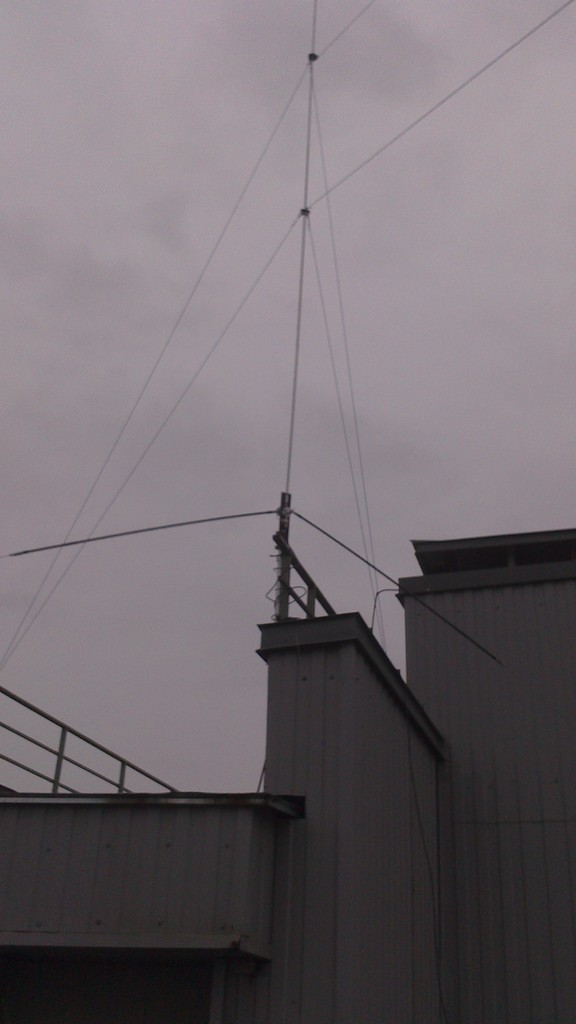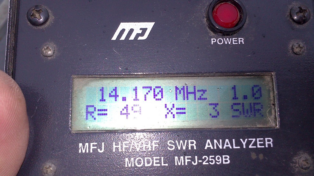 При изготовлении вертикальных антенн, всегда на крыше, как правило, не хватает места под противовесы и поэтому приходиться "мудрить" с этими противовесами, вот предлагаю в качестве противовесов использовать антенны MFJ. На фото 5-и метровый штырь на 20-ти метровый диапазон с применением в качестве противовесов двух антенн MFJ-1620. Применение этих антенн позволило легко настроить антенну в резонанс на необходимой частоте. Сама настройка очень простая: резонанс настраивается изменением длины противовесов (антенн MFJ-1620), а требуемое входное сопротивление (50 Ом) изменением угла между основным излучателем и противовесами. Опасения были в том, что противовесы укороченные и это может сильно сузить рабочую полосу, но даже при таком укорочении, полоса по уровню КСВ=2 составила около 800 кГц.