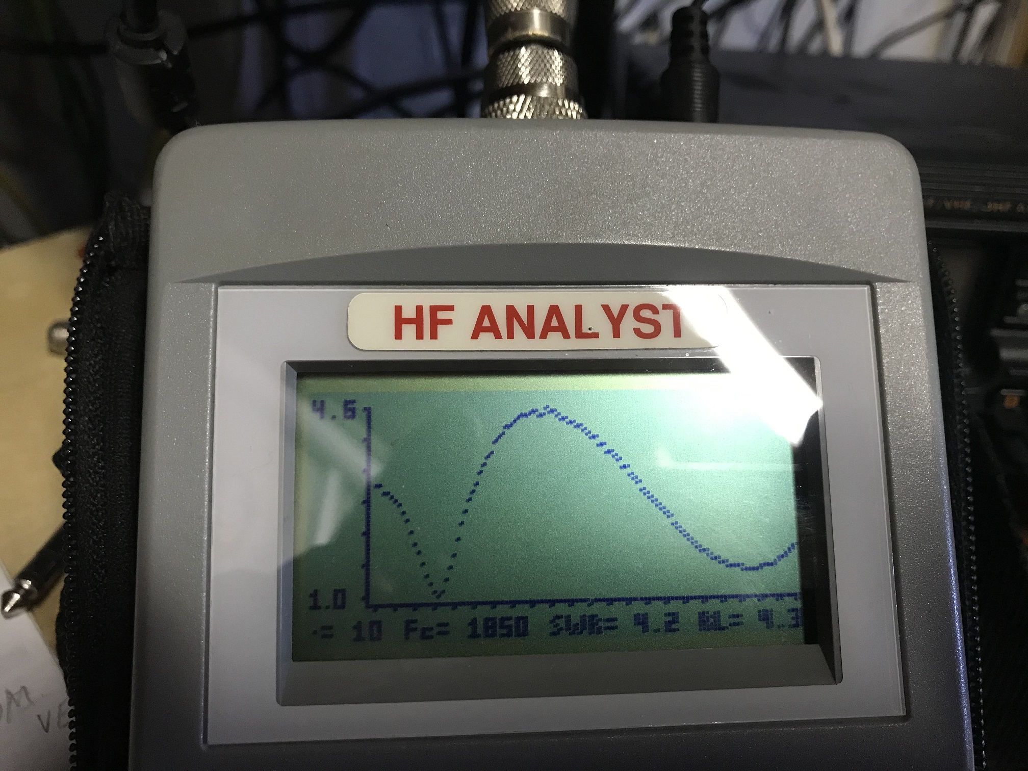 В связи с улучшение WX продолжил изыскания по настройке антенны. Увеличение плеча 9 м почти на метр, несколько улучшило КСВ 7 мГц с 3,4 на 2.7 и чутка подпортило на других диапазонах. Хуже всего на 21 мГц было 1.5 стало 2,3 Дальнейшее увеличение этого элемента возможно еще более улучшит КСВ на7 мГц, но уже будет значительно хуже на других. Так что оставил как есть. Касательно резонанса на 1.5 мГц, пришел к выводу что это резонанс самого балуна . т.к. при значительном изменении геометрии антенны, резонанс на этой частоте практический не меняется. К сожалению с 160 м диапазоном добиться улучшения не получилось. Полагаю что все же надо будет поднимать антенну выше. С кабелем еще не пробовал, но полагаю что вряд ли значительно что то изменит. Однако попробовать стоит. Длина кабеля не более 15 метров. Анализатор AEA на частоте 1,850 мГц показывает SWR/RL (Return loss) 4,2/4,2 В любом случае получилась довольно не плохая многодиапазонная антенна работающая почти на всех диапазонах без АTU. В сравнении с вертикалом, несколько шумновата и на дальних трассах проигрывает на 1-2 балла.