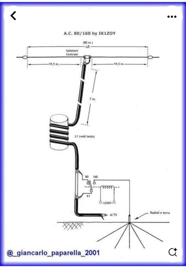 Интересную конструкцию диполя на 160 (80) метров подсмотрел в интернете. По крайней мере раньше не встречал. Почему указано реле на 24 а не 12 вольт , не знаю. Может корифеи антенностроения подскажут... Вложение: