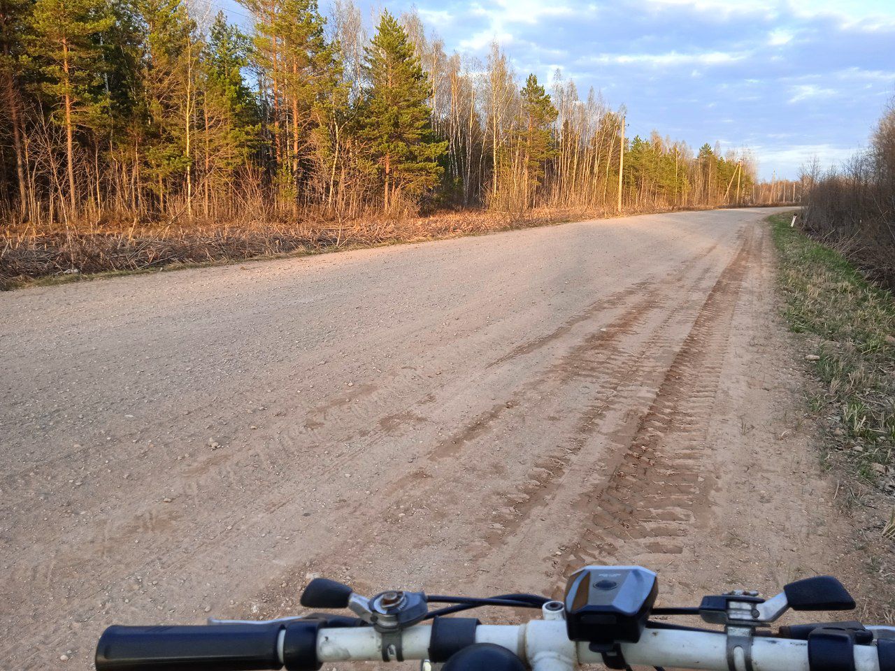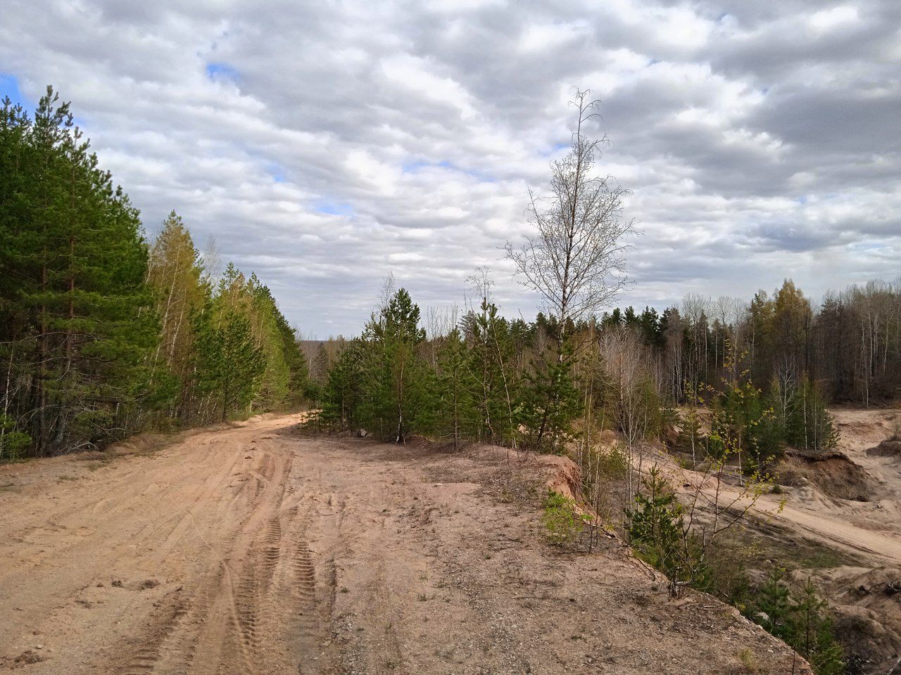 Дорога к карьеру, как это часто бывает, была песчаной. Вполне прикатанная, хотя ещё виднелись следы потёков от таяния снега и ручьёв на дороге. В добавок, дорога решительно пошла вверх, так что пришлось вести велосипед вручную. Думаю, в дождливую погоду на не полном приводе здесь могут быть проблемы. Поднявшись на добрые 30 метров, по ощущениям, взору представился карьер. За 50-70 метров до него был какой-то накатанный более свежими следами поворот направо, решил оставить его как запасной вариант. Вложение: