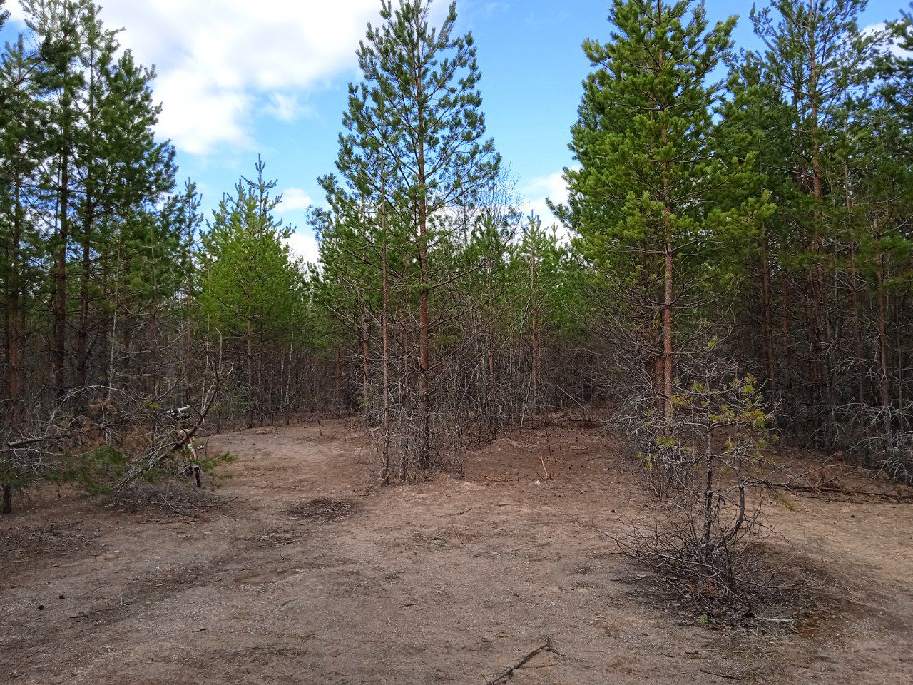 С вершины в бок уходила накатанная дорожка, поднимающаяся вновь на высоту, и петляющая между сосен. Решил попробовать съездить туда, по карте максимальная высота именно там. Как оказалось, карта немного неверна - максимальная высота всё же у карьера. GPS показывал на метр меньше. Но зато взору предстала шикарная поляна с молодыми сосновыми посадками. Поляна вместит не одну, а добрые два десятка палаток. За сосновыми посадками прослеживался березняк. Вложение: