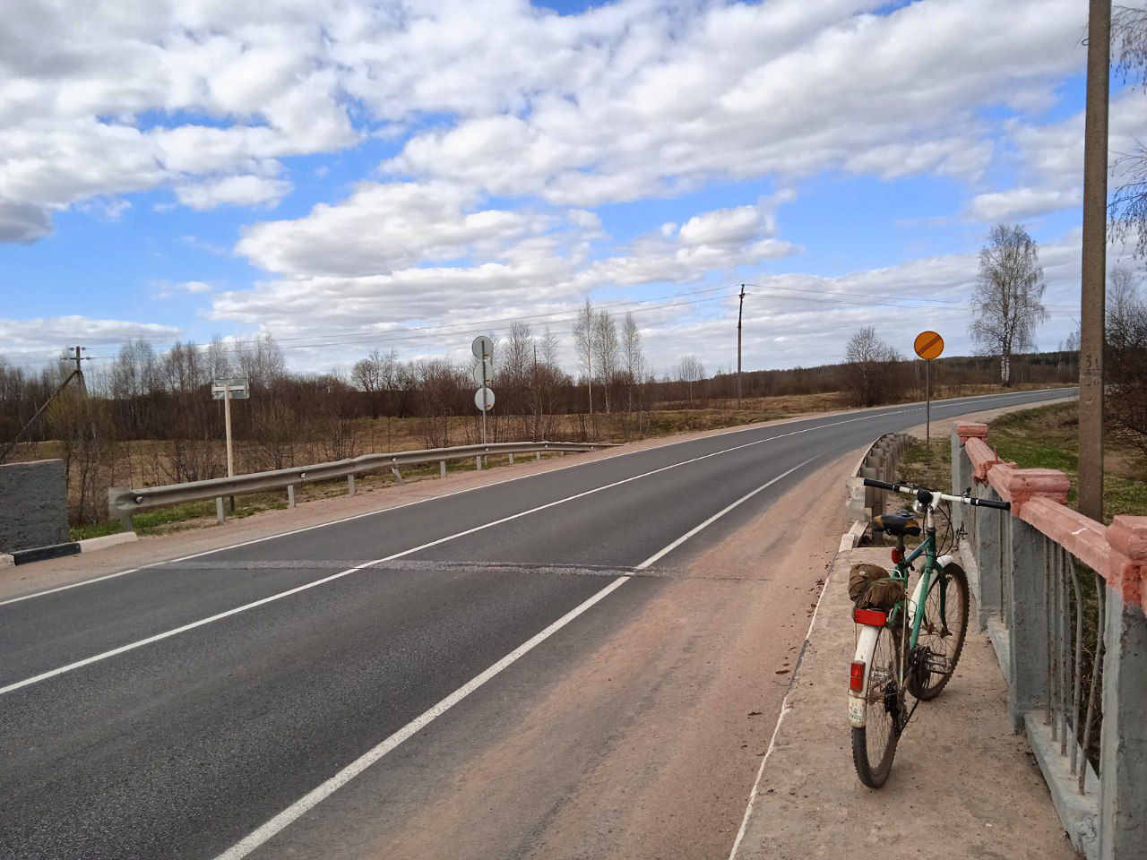 На подъезде к Сорокино велись работы по замене водопропускной трубы, сужение дороги до одного ряда. Знаки обещали светофор для реверсивного движения, но его решили не ставить - поток машин очень мал. После проследования Сорокино перестал принимать свой шлюз APRS. Он меня, соответственно, тоже. В Поречье на дорогу выбежала и начала преследовать собака - главный враг велосипедиста. Кто-то использует электрошокер для отпугивания - не любят запах озона, кто-то на ходу бьёт пяткой по носу, я предпочёл резкий разворот и команду На место. Обычно, если собака умная, она от такого подхода офигевает, и отправляется в границы участка, а то вдруг и вправду на место надо. Хотя, собаки, выбегающие на шоссе или улицу, обычно заканчивают свою жизнь под колёсами автомобиля. Ну а я развернулся, и, спешившись, решил сразу отдохнуть. Заодно остановился на мосту. Вложение: