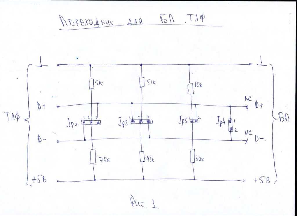 Бывает подключишь на зарядку телефон (ТЛФ), а он больше тока в 500 мА "не берет", хотя может. Причиной как правило является наличие того или иного напряжения на проводах передачи данных D+ и D-. Вот схема простого переходника позволяющего устранить это. На схеме имеется ряд делителей напряжения и перемычек, комбинацией которых можно задать разные напряжения на D+ и D-, наличие напряжений на этих выводах сигнализирует телефону, что он подключен к зарядному устройству (ЗУ), а не к ПЭВМ и ТЛФ может затребовать от ЗУ повышенного тока. Самый популярный вариант это замыкание JP4 - такое соединение имеют большинство ЗУ. При замыкании JP3 и JP4 - это как правило Самсунги. При замыкании JP1 и JP2 - контакты 1-2 - это как правило айфоны и некоторые модели китайских ТЛФ. Вообщем комбинируя эти перемычки можно задать нужный режим зарядки ТЛФ.