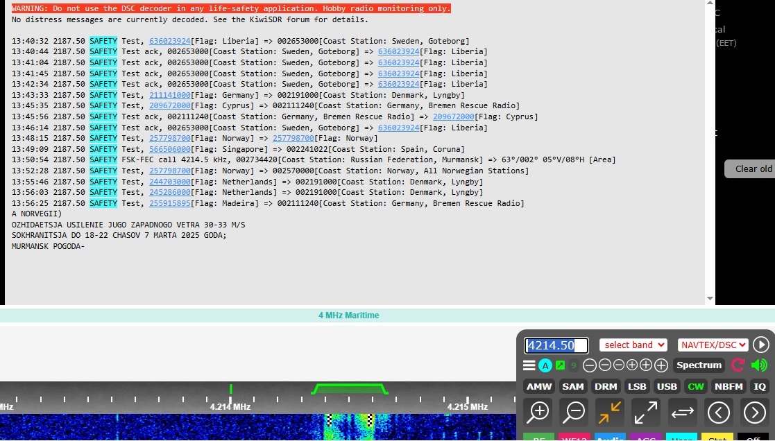 Балуюсь удалённым sdr из финляндии на сайте http://kareliaswdx.ddns.net:8074/принимаю dsc и декодирую с помощью встроенного в сайт плагина. Очень удобно. увидел на 2187,5 сообщение от Мурманской береговой станции пока соображал что нужно перейти на частоту 4214.5 и переключится на Navtex...ухватил только кусочек русского текста