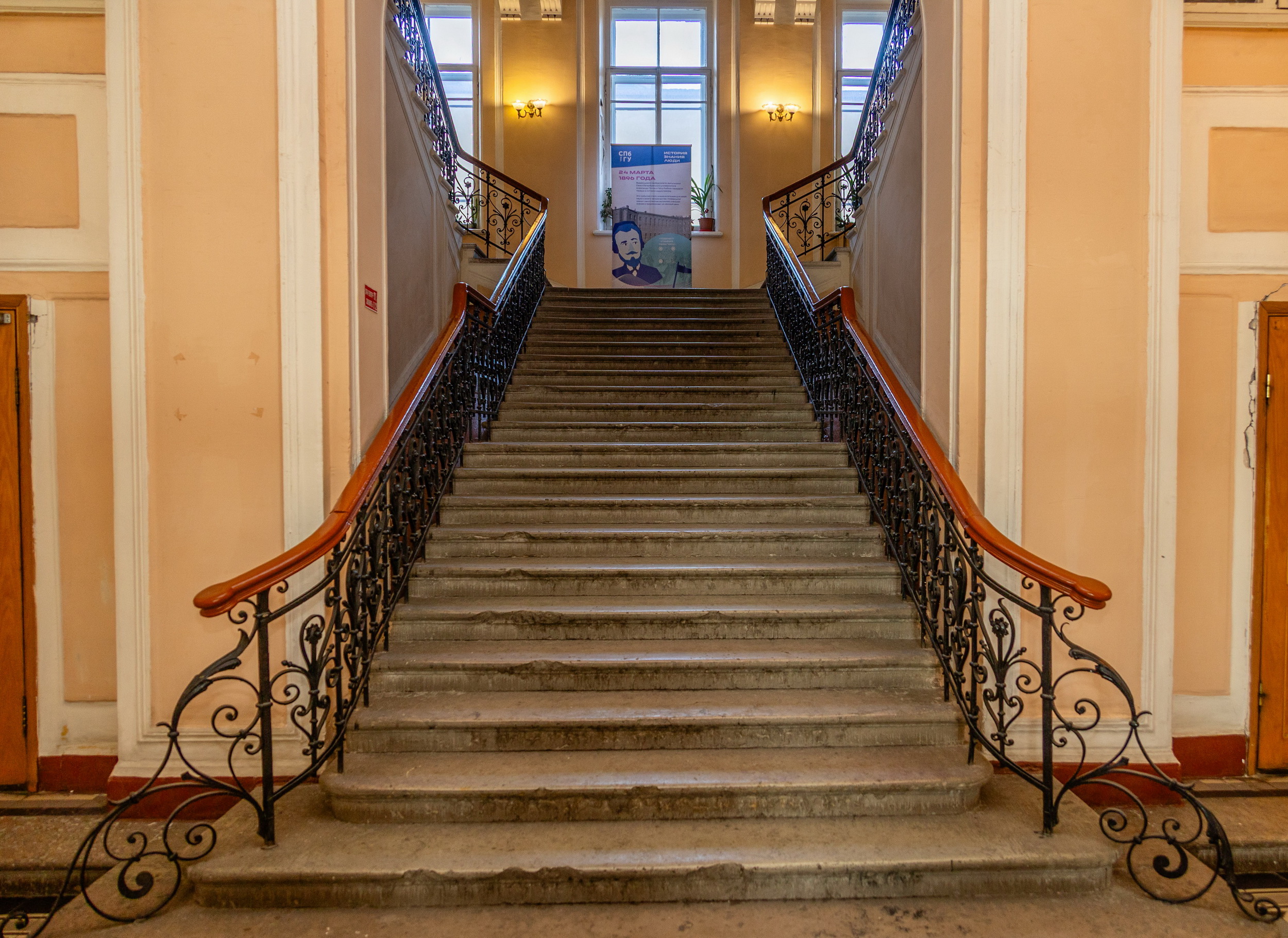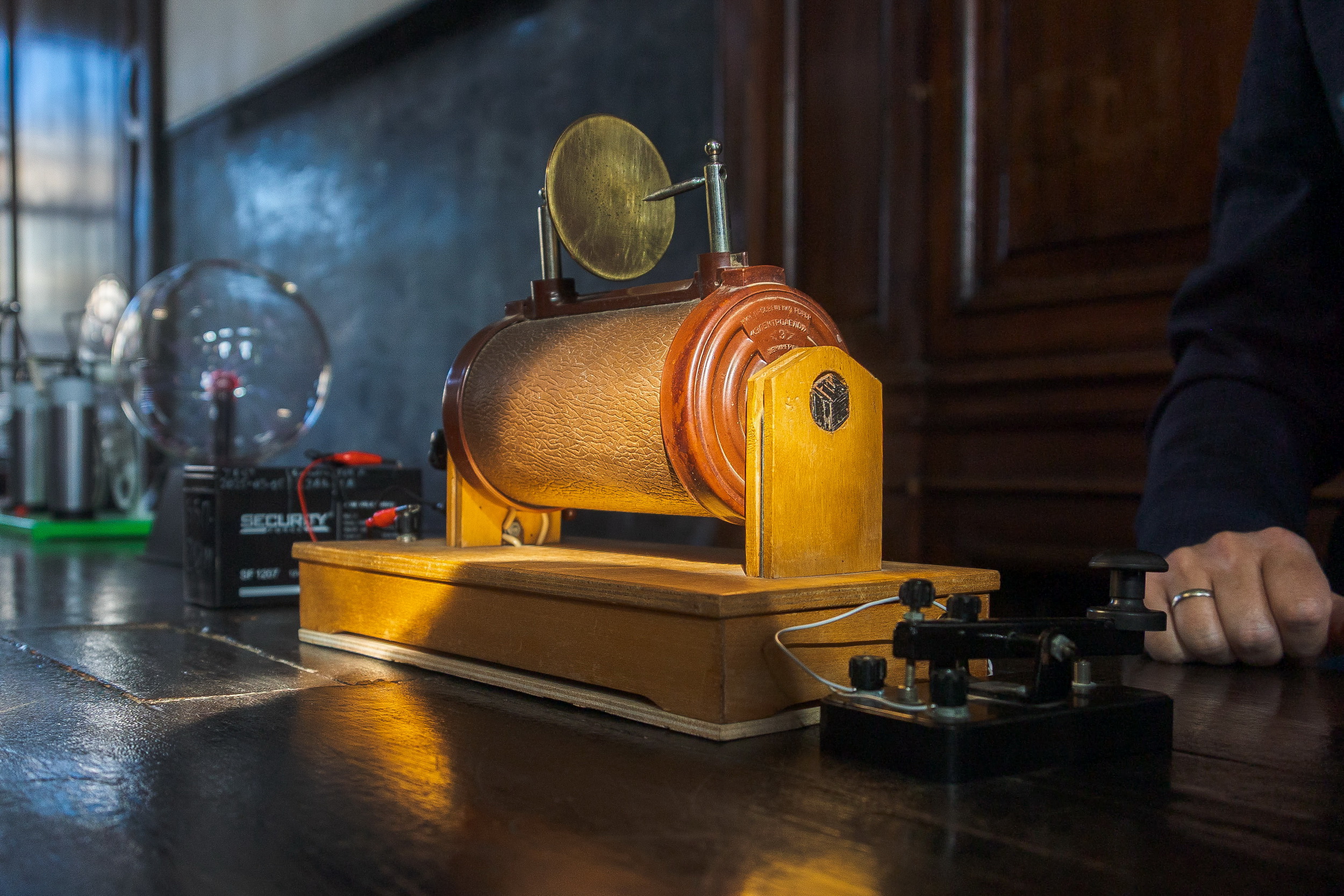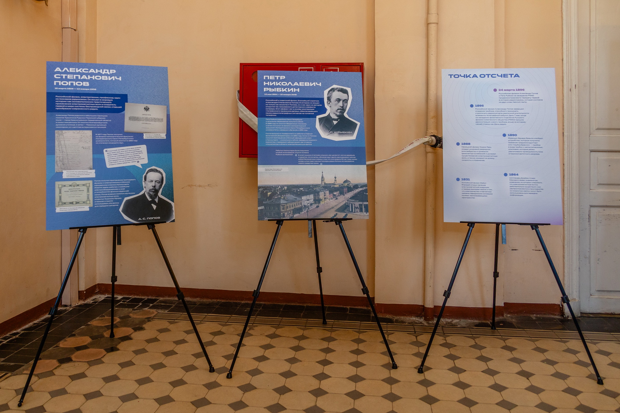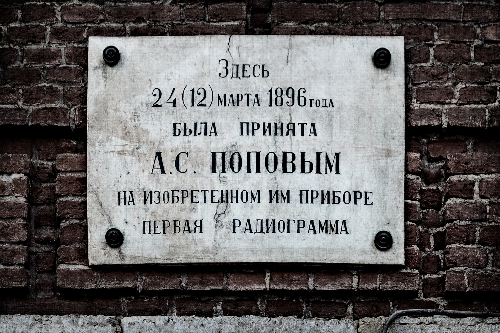 Первая радиограмма была передана именно здесь – между двумя корпусами Университета: Жё-де-пом и Менделеевским центром на Васильевском острове. Петр Николаевич Рыбкин, ассистент Александра Степановича Попова, при помощи прибора передал беспроводное сообщение с помощью азбуки Морзе, которое принял Александр Степанович Попов в здании Жё-де-пом. Сообщение содержало имя известного немецкого физика: Heinrich Hertz.