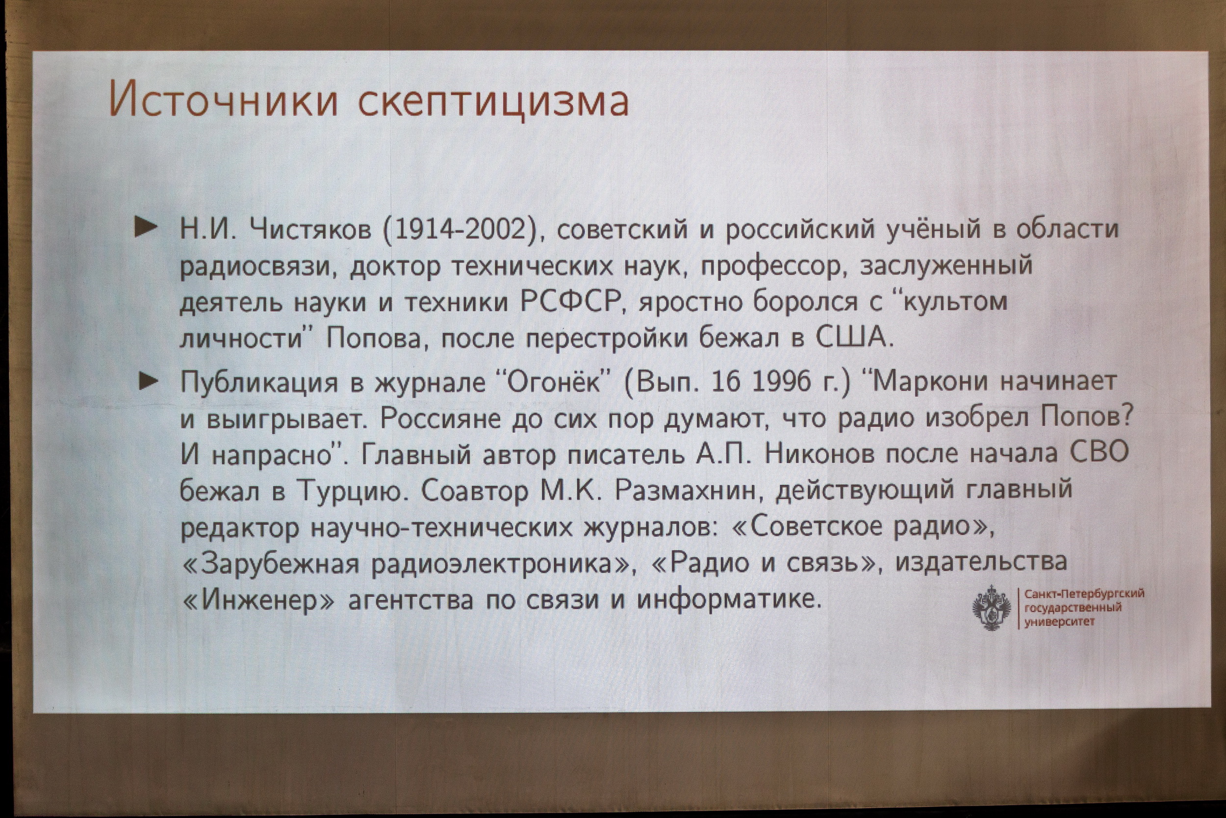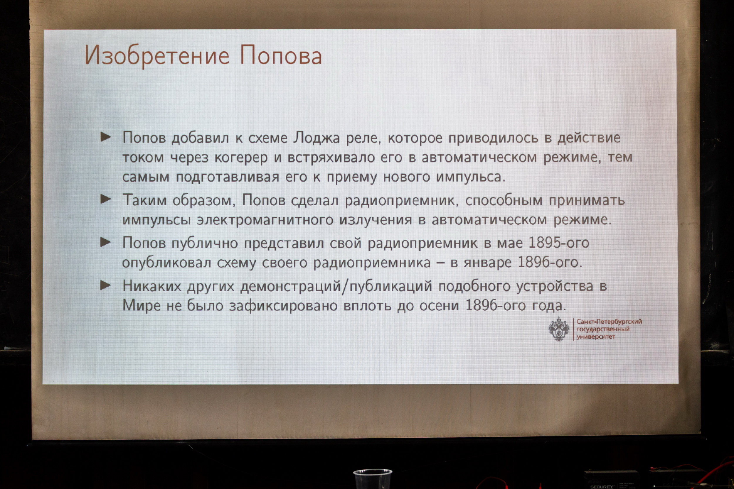 Сегодня в Санкт-Петербургском государственном университете (СПбГУ) расположенного по адресу Университетская наб., д. 7–9–11 (в помещении старинной большой химической аудитории) прошло мероприятие, посвященное 130 летию со дня первой в истории радиограммы.