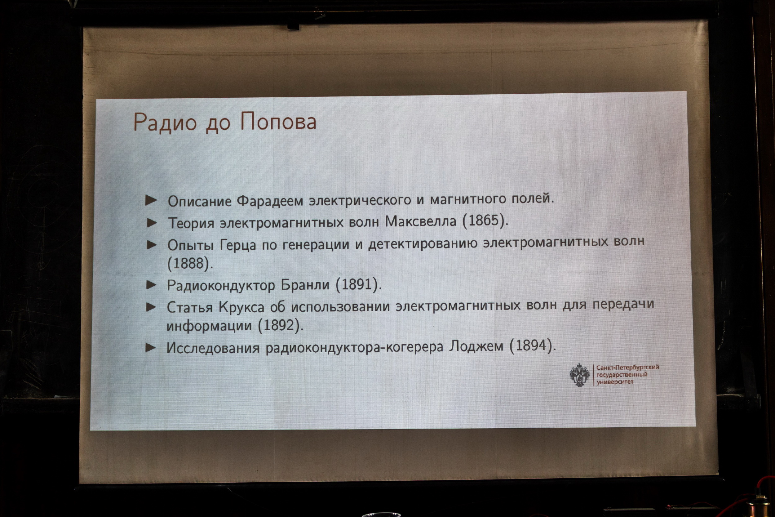 Научно-популярная лекция доцента кафедры астрономии СПбГУ Сергея Дмитриевича Петрова, посвященная историческим фактам, связанным с открытием беспроводной передачи сообщений. Фактическая демонстрация передачи радиосообщения с использованием аппаратуры, специально созданной учеными Университета и максимально приближенной к оборудованию, продемонстрированному профессором Поповым 130 лет назад.