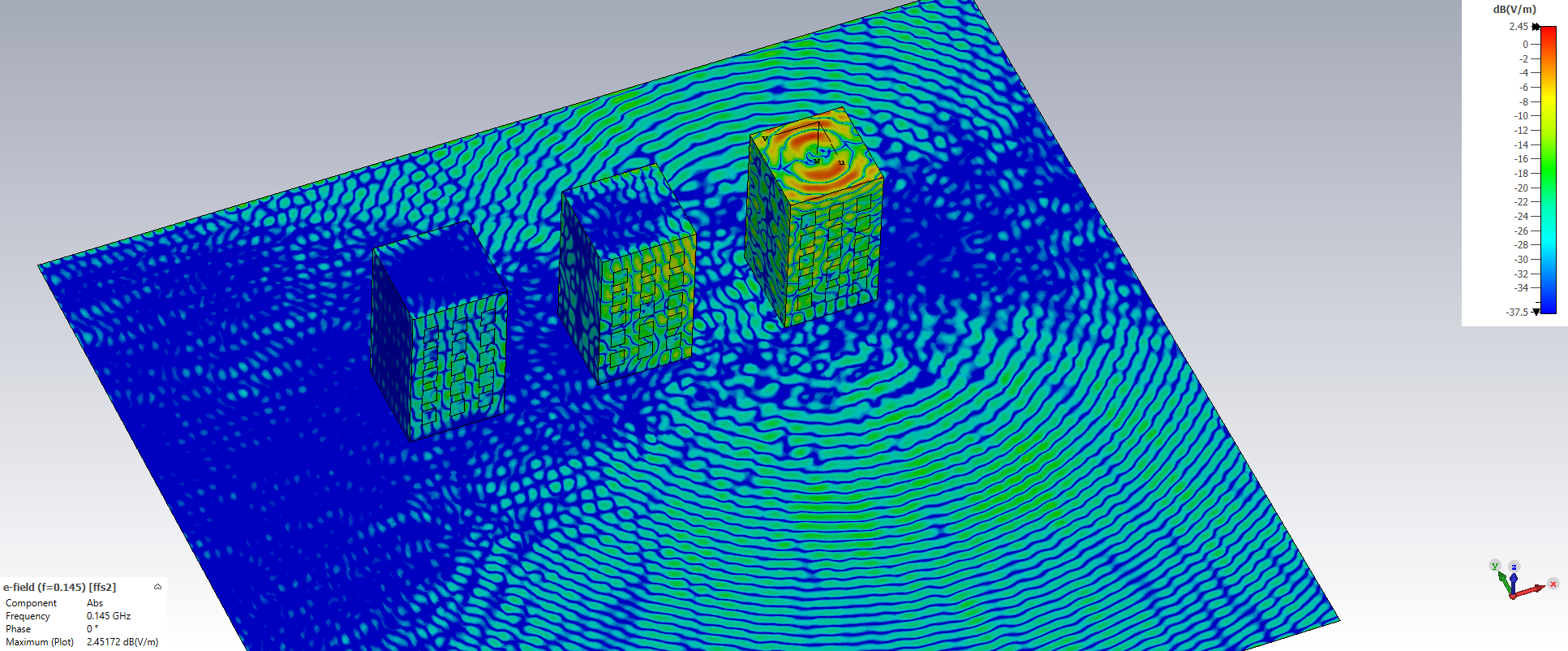 Вот например какая напряженность ЭМ поля в вольтах на метр получается от диполя на частоте 145 МГц в плоскости 5 этажа.