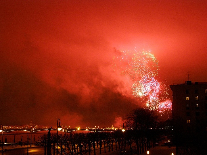 Вот его текст : " Вечерний салют в честь первого выхода в эфир RF1A. Фото с бота Крейсера "Аврора" ! "