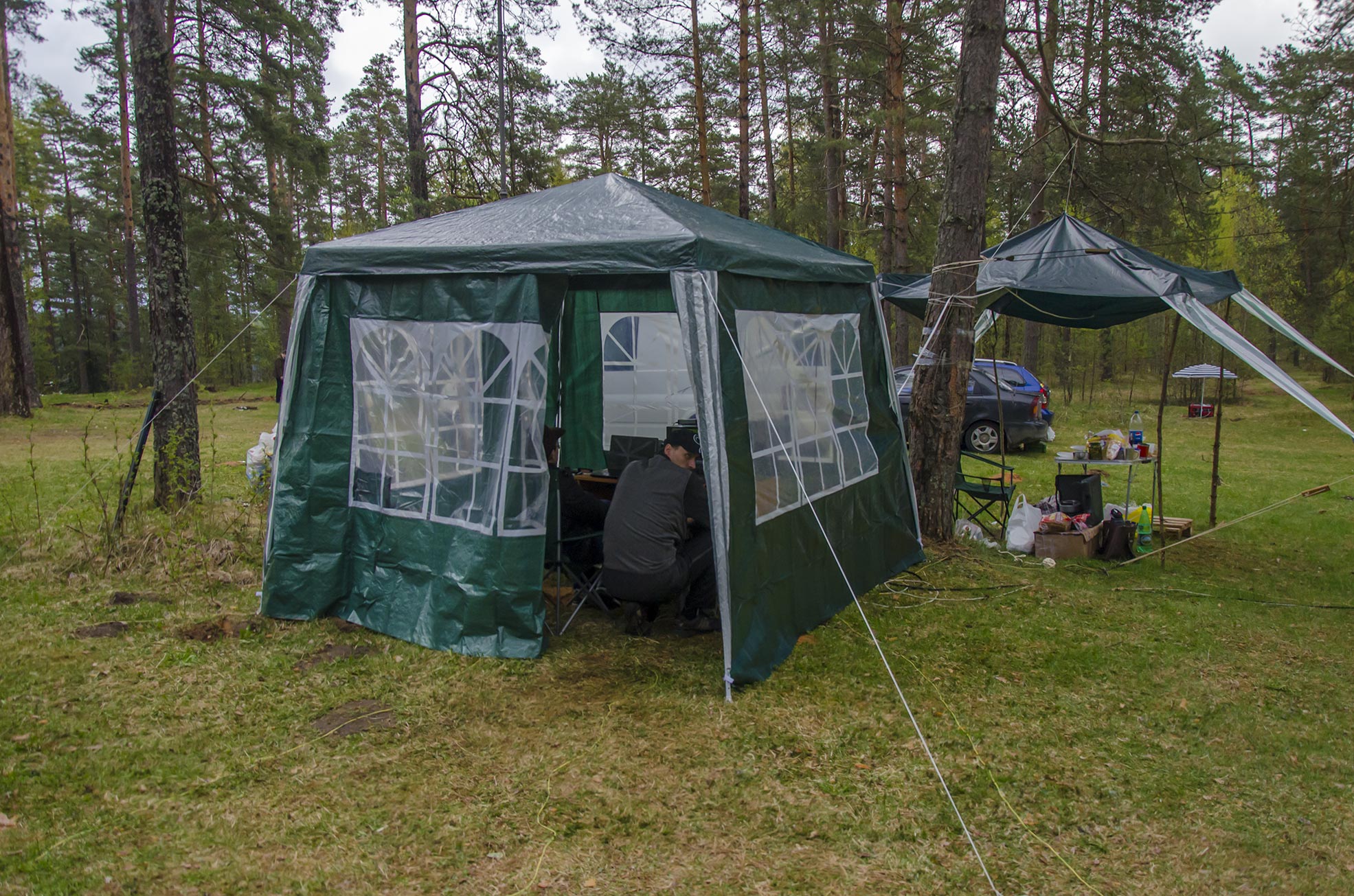 Быстро наступал вечер. Опять пошел дождик и мы укрылись в шатре уже бывшей главной радиорубки, где на столе вместо аппаратуры была расставлена еда, которой осталось очень много. Дождик был коротким, и ребята решили зажечь мангал и пожарить сосисок. Время было уже около 19 вечера. Я решил тоже не оставаться ещё на одну ночь. Посидев с коллегами, дабы хоть немного ещё составить компанию, я в начале восьмого вечера выехал домой. Парни остались ещё на одну ночь, подъедать остатки провианта.  Вот и всё. Серию фотографий из лагеря RP69LU у озера Омчино в Луге я закончил. Осталось видео. С этим вопросом немного придётся подождать, поскольку работа над видеороликом достаточно кропотливая. Что бы вам всем было понятно, я покажу только небольшой пример, что приходится на начальном этапе делать с отснятым материалом. Смотрите. То есть, что бы было понятно, в постобработке происходит очистка картинки от шумов, корректировка баланса белого, корректировка тонов, сведение звука с внешних микрофонов и пр. Процесс более быстрый, по сравнению с монтажом. Монтаж - это уже творчество, как бы. После постобработки надо смонтировать всё отснятое в какой-то смыловой видео и звуковой ряд. На это тоже потребуется время. Дождётесь?