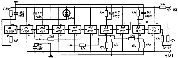 Электронный манипулятор для «лисы». Функциональная схема манипулятора приведена на рис. 92. Он состоит из однотипных узлов двух видов: мультивибратора М и блокинг-генератора Б (рис. 93, а и б). Номиналы конденсаторов С1 каждого узла указаны на функциональной схеме.