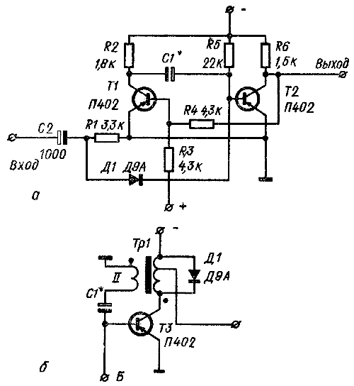 Рис. 92. Функциональная схема электронного манипулятора Рис. 93. Принципиальные схемы мультивибратора ( а) и блокинг-генератора ( б)