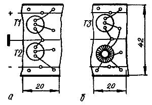 Рис. 94. Детали монтажнои платы манипулятора Манипулятор смонтирован на гетинаксовой плате размерами 42Х220 мм. Каждый узел занимает по длине 20 мм (рис. 94). Необходима экранировка и развязка цепей манипулятора от мощных каскадов передатчика.
