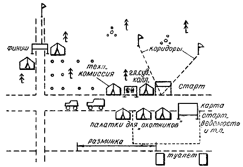 Рис. 95. Пример размещения оборудования старта-финиша соревнований На рис. 95 приведена примерная схема размещения оборудования старта-финиша. На старт все участники должны ехать вместе. Перед сдачей аппаратуры рекомендуется разрешить «охотникам» проверить приемники, в это время «лисы» не работают на передачу.