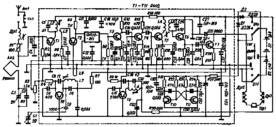 Схема приемника приведена на рис. 26. Сигнал с рамочной антенны поступает на вход усилителя ВЧ (Т1). Смеситель (Т2) нагружен пьезокерамическим фильтром типа ФП1П-011. Полоса пропускания фильтра 8,5 кгц. Промежуточная частота приемника равна 465 кгц (частота гетеродина ниже частоты сигнала). Усилитель ПЧ имеет два апериодических (Т3, Т4) и один резонансный (Т5) каскады. Эмиттерный детектор (Т6) имеет высокое входное сопротивление и подключен непосредственно к последнему контуру ПЧ. Усилитель НЧ (Т7) нагружен на один телефон типа ТОН-2. В приемнике есть второй гетеродин для приема телеграфных сигналов (Т9) и мультивибратор (Т10, Т11), колебаниями которого, сглаженными цепью R17C25, модулируется сигнал промежуточной частоты в последнем каскаде усилителя ПЧ. В провода телефона включены дроссели Др2, Др3 для фильтрации ВЧ напряжения, наводимого полем «лисы». Диоды Д1 и Д2 служат для того, чтобы раздельно включать второй гетеродин и тон-генератор при включенном питании остальных каскадов.