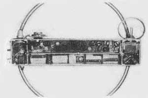 Конструкция. На рис. 27 показано размещение основных узлов и деталей в коробке, сделанной из дюралюминия толщиной 1,2 мм. Размеры коробки 50х28Х260 мм. Поперечные перегородки разделяют коробку на три отсека. Отсек питания отделен дополнительной продольной стенкой и обклеен плотной бумагой. Внешний вид приемника с антенной показан на рис. 18.