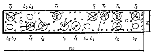 Рис. 28. Монтажная плата и размещение транзисторов. Налаживание. Вначале следует проверить цепи питания. Рабочий ток в цепях питания (здесь и далее все напряжения обозначены относительно корпуса приемника, который имеет нулевой потенциал) при максимальном усилении должен быть равен 10—12 ма.