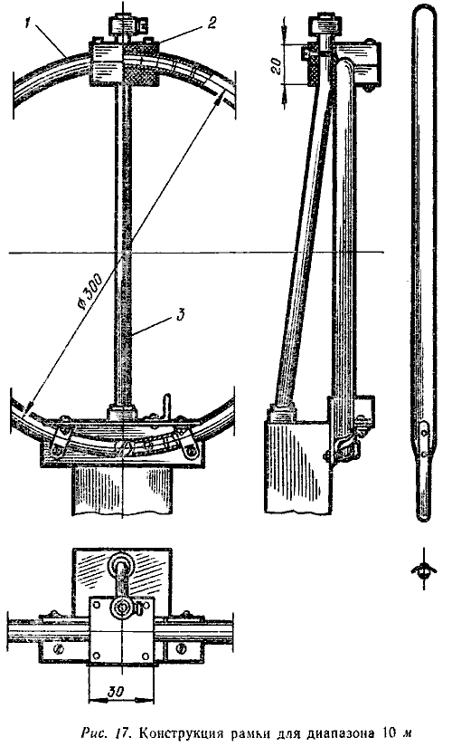 Рамка для диапазона 10 м. Общий вид антенны со штырем дан на рис. 17. Кольцо-экран 1 выполнен из дюралюминиевой трубки диаметром 8 мм. Виток из провода ПЭВ-1 0,5 расположен возможно ближе к оси трубки с помощью изоляторов-бусинок толщиной 1 мм из полиэтилена, надеваемых с трением на провод на расстоянии 20 мм друг от друга. Важно, чтобы емкость между проводом и трубкой была минимальной и стабильной, не изменялась при тряске. Симметрично относительно щели в трубке просверлено сквозное отверстие диаметром 4 мм для укрепления на коробке, а по обе стороны от него на расстоянии 10 мм - по одному отверстию диаметром 5 мм (для выводов провода). Соответствующие отверстия надо сделать и в коробке, и в специальном угольнике из дюралюминия, который применяют для прочности. В месте разреза рамка скрепляется и защищается от влаги разрезной текстолитовой бобышкой 2. На выводы провода, а также на его участок, расположенный в зазоре, надевают изоляционную трубку. Жесткое основание штыря 3 укреплено на коробке и в бобышке под углом к плоскости рамки, что позволяет повысить прочность всей антенны. На конец основания надевают удлинительное перо из желобковой рулетки. Щели в разрезе бобышки и в других местах заливают после сборки эпоксидной смолой или водостойким клеем.
