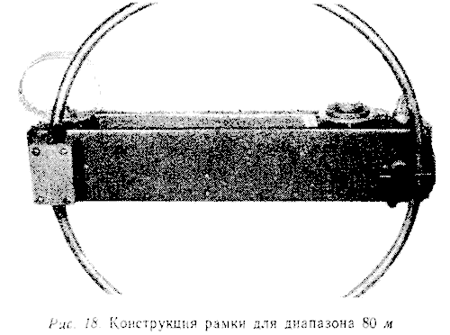 Рамка для диапазона 80 м. Рамка на 80 м может отличаться от описанной выше конструкции лишь большим количеством витков. Другая конструкция антенны, более прочная и удобная при перевозке, приведена на рис. 18. Рамка как бы вывернута щелью вниз. В конструкции на рис. 17 максимум кардиоиды направлен в сторону соединяемого со штырем вывода, а в антенне на рис, 18— в противоположную сторону.