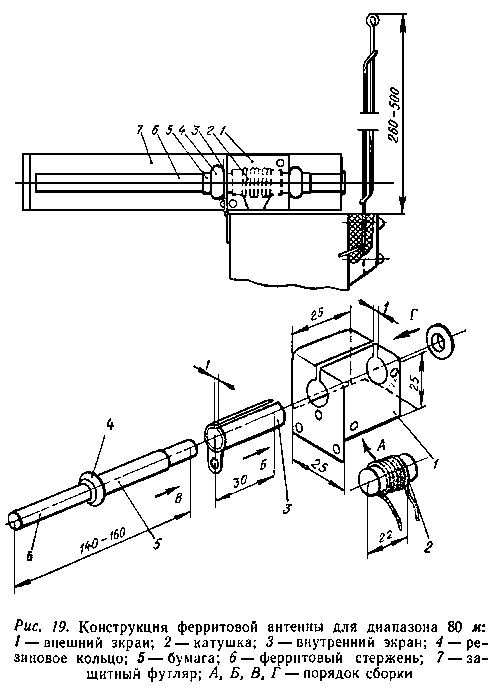 Ферритовая антенна. Для устранения антенного эффекта магнитную антенну, подобно рамке, помещают в экран. Общий экран в виде большого металлического цилиндра с разрезом в этом случае непригоден. На рис. 19 приведена одна из испытанных конструкций фер-ритовой антенны на 80 м [18]. Здесь же указана последовательность сборки. Катушка должна свободно надеваться на экран-трубку, трубка с трением входить в отверстия внешнего экрана, а ферритовый стержень, обклеенный полоской бумаги, туго сидеть внутри трубки. Антенна прикреплена к корпусу приемника четырьмя винтами, в верхней стенке корпуса для концов катушки, делают отверстия. Защитный футляр предохраняет хрупкий ферритовый стержень от поломки при ударах.