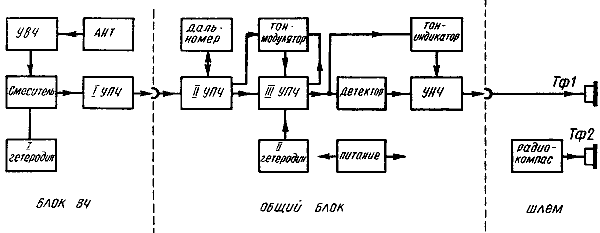 Рис. 35. Блок-схема трехдиапазонного приемника Схема общего блока приведена на рис. 36. Два каскада усилителя ПЧ (Т1, Т2) имеют в коллекторных цепях по два контура: на 4500 и на 355 кгц, включенных последовательно. Общее усиление двух каскадов по напряжению — около 100. Каждый каскад имеет детектор управления (Д1, Д2). Детектор приемного тракта нагружен на двухкаскадный усилитель НЧ (ТЗ, Т4). К приемнику подключен шлем с радиокомпасом (рис. 50) и телефоном.