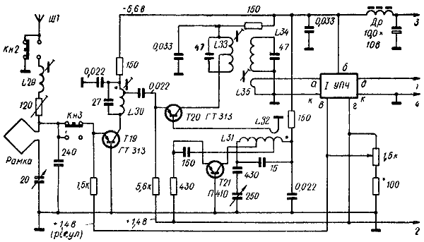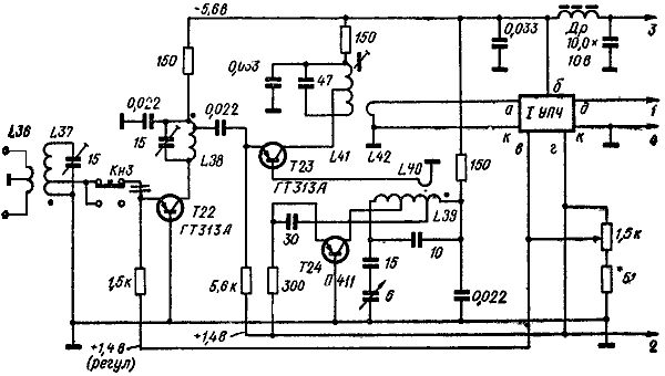 Во втором гетеродине (Т11), который может работать на любой из двух ПЧ, для устранения захватывания часчастоты сильным сигналом применен эмиттерный повториль (Т12).