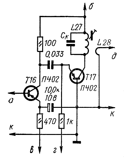 Рис. 38. Схема ВЧ головки на 10 м При дальнейшем увеличении входного напряжения громкость сигнала перестает расти, и на выходе будут заметны только изменения частоты модуляции. Достигнув значения 5 в, коллекторное напряжение Т9 расти далее не будет. Примерно в это же время открывается Д1, и через Т6 постепенно закрывается отрицательным напряжением транзистор Т8, до сих пор открытый. Закрывание Т8 приводит к увеличению постоянной времени наряда конденсатора в цепи базы транзистора Т9, частота следования импульсов понижается до 10—15 гц, пока не прекратится рост напряжения на базе транзистора T6. Если чувствительность общего блока составляет 0—50 мкв, то изменения частоты модуляции еще заметно при увеличении входного напряжения свыше 50 мв.