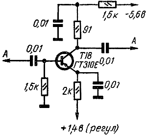 Схемы блоков ВЧ приведены на рис. 37—39. Они не имеют особенностей. В каждом блоке применен кнопочный ослабитель сигнала (примерно на 20 дб). Схемы первого каскада усилителя ПЧ всех головок одинаковы (рис. 40), разные только элементы контуров. При слабой связи в ФСС или большом затухании сигнала в нем, возможно, окажется недостаточным усиление одного каскада усилителя ВЧ на 80 м. На рис. 41 приведена схема дополнительного апериодического усилителя ВЧ, включаемого последовательно в точку А (см. рис. 37).
