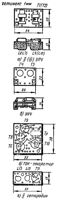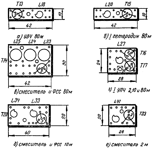 Рис. 42. Монтажные платы узлов общего блока Рис. 43. Компоновка общего блока Монтаж большинства каскадов приемника — узловой, двусторонний, на проволочных штырьках с колечками. На рис. 42 и 44 приведены чертежи монтажных плат отдельных узлов.