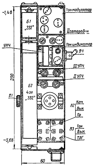 Рис. 47. Общий вид приемника с головкой на 2 м в сборе Тон-модулятор должен устойчиво работать при отсутствии отрицательного напряжения на коллекторе транзистора Т9. Начальную частоту генерации устанавливают подбором конденсаторов в цепях коллектора и базы транзистора Т9. Чем меньше сопротивление резистора R1, тем больше глубина модуляции сигнала, но тем сильнее нежелательное «пролезание» тона без сигнала.