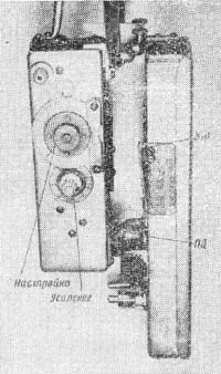 Рис. 46. Компоновка ВЧ головки на 2 мГоловка ВЧ жестко соединена с общим блоком с помощью четырехконтактного экранированного разъема ШР-20 и двух винтов МЗ с накаткой. Органы управления, используемые при поиске, находятся под пальцами левой руки, которой спортсмен держит приемник за головку как при беге, так и при пеленговании.